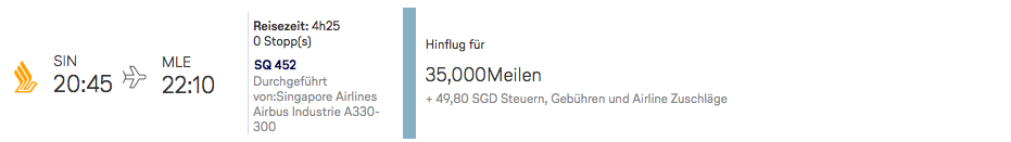 Der Singapore Airlines Flug von Singapur nach Male ist natürlich im ersten Moment eine sehr attraktive Option, zumal er recht einfach als Prämienflug zu haben ist. Allerdings würdet Ihr in diesem Fall mit Singapur in Südost Asien eine dritte Zone berühren, so dass der Meilenpreis deutlich steigt.