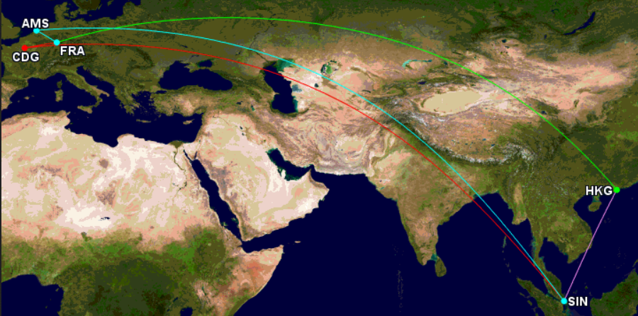 Wahrscheinlichkeit mit Cathay: 0-0,5%. Wahrscheinlichkeit mit KLM: 25%.