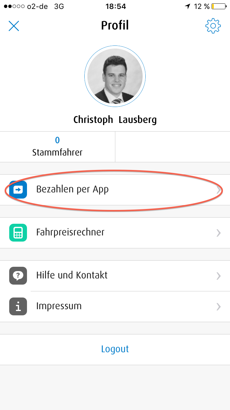 Wenn Ihr die mytaxi App öffnet, klickt ihr oben rechts auf das Profilbild.