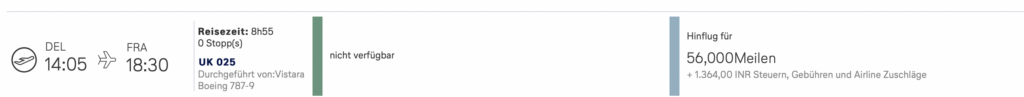 Beispiel: Vistara Prämienflug bei Miles&More von Delhi nach Frankfurt in der Business Class für 56.000 Prämienmeilen und etwa 15 Euro Steuern und Gebühren.