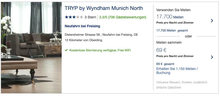 Wer in den kommenden Wochen eine Übernachtung plant oder einen Mietwagen benötigt, sollte sich bei „Hotels&Cars by Points“ umsehen. Teilweise findet Ihr dort günstige Hotels, die Buchung wird häufig mit 1.000 oder mehr Meilen belohnt. Für das Erreichen der Challenge reicht bereits ein Sammelwert von mindestens 500 Meilen. Bei der Suche nach einem Flughafenhotel in München ist mir z.B. dieses Hotel aufgefallen. Es kostet nur 69€ und bringt Euch 1.150 Meilen ein.