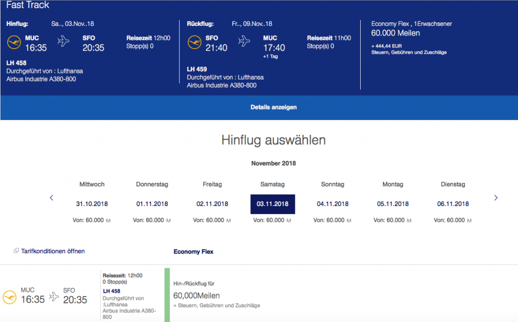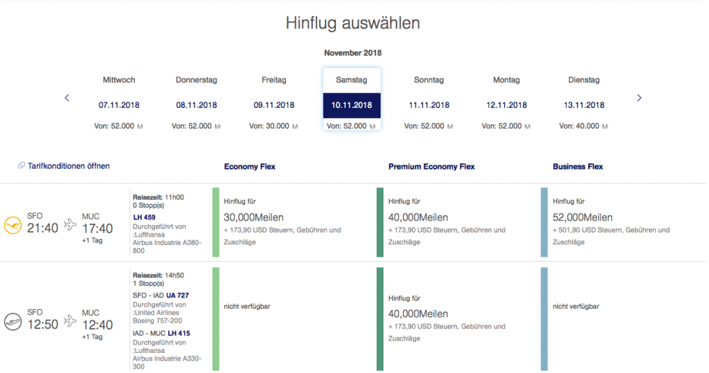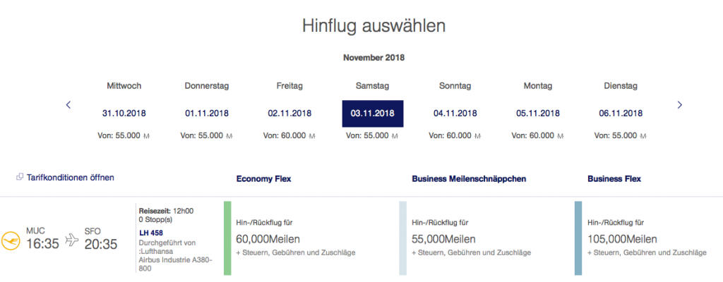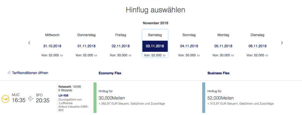 Meine Suchanfrage für den Hinflug zeigt mir nun an, dass bereits am meinem Wunschdatum, dem 03.11.2018 ein Business Class Prämienflug mit Lufthansa auf der Strecke München nach San Francisco verfügbar ist.