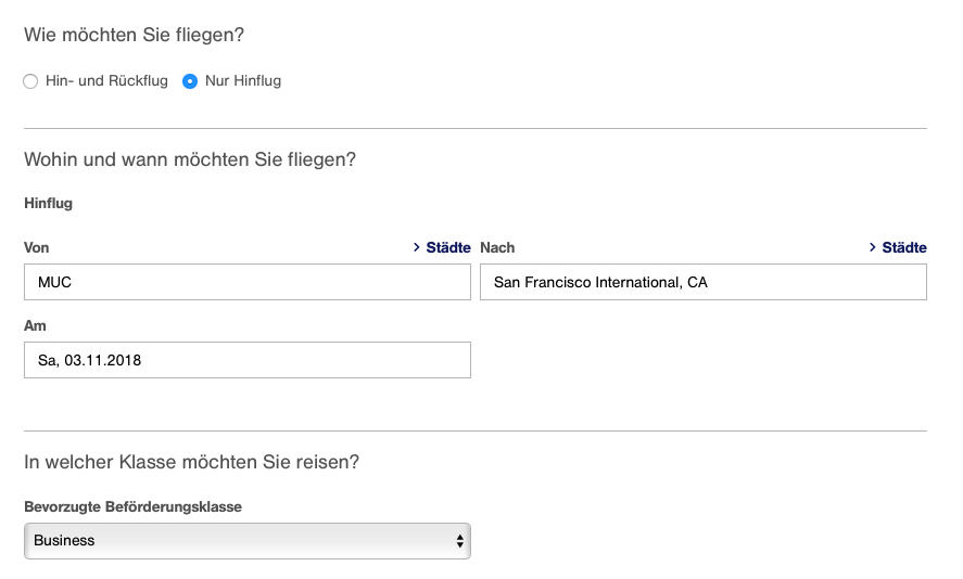 Als Lösung des Problem empfiehlt es sich, die Flüge Segment nach Segment direkt auf der Miles&More Homepage zu suchen. In unserem Beispiel möchte ich von München nach San Francisco als Meilenschnäppchen in der Business Class buchen. Meine bevorzugten Daten sind der 03.11.2018 für den Hin- Flug und der 09.11.2018 für den Rückflug.