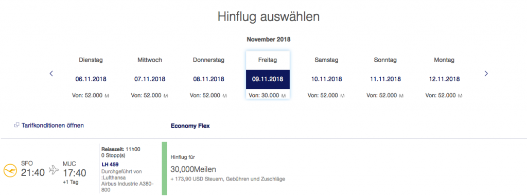 Wie man auch gut sehen kann, sind deutlich mehr Meilenschnäppchen verfügbar, als man ursprünglich dachte! An jedem Tag, an welchen in der Übersicht 55.000 Meilen unter dem Datum angezeigt werden, gibt es mindestens ein Meilenschnäppchen in der Business Class nach San Francisco.