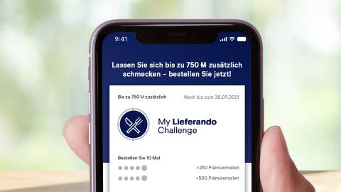 Entdecken Sie in der Miles & More App Ihre persönliche My Lieferando Challenge. Wenn Sie Ihr individuelles Bestellziel erreichen, sichern Sie sich bis zu 500 Prämienmeilen zusätzlich.