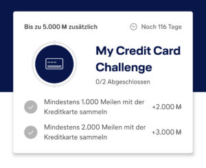 Die Höhe der zu erreichenden Prämienmeilen richtet sich nach den in der App ausgespielten Angeboten. Zum Erreichen der Challenge werden nur im Aktionszeitraum gutgeschriebene Prämienmeilen berücksichtigt. Die Gutschrift der Prämienmeilen aus der Challenge erfolgt zeitnah nach Erreichen Ihres individuellen Zielwertes. Grundsätzlich werden die Prämienmeilen berücksichtigt, die im Rahmen Ihrer monatlichen Kreditkartenabrechnung ausgewiesen werden.