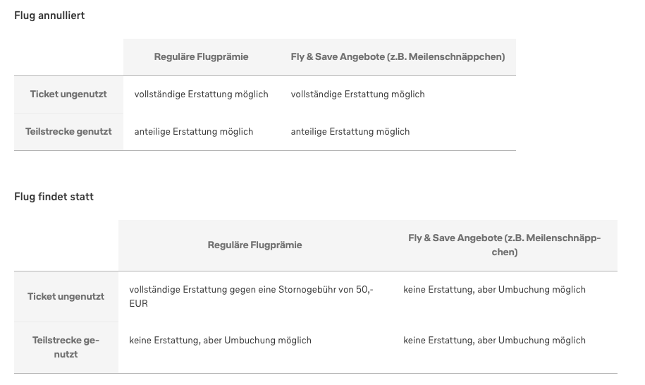 Sollte der Flug seitens der Airline gestrichen werden, gilt natürlich weiterhin, dass Ihr kostenlos umgebucht werdet oder das Ticket kostenlos stornieren könnt. In diesem Fall würden auch bei einem Meilenschnäppchen alle Steuern und Gebühren, sowie Meilen erstattet werden.