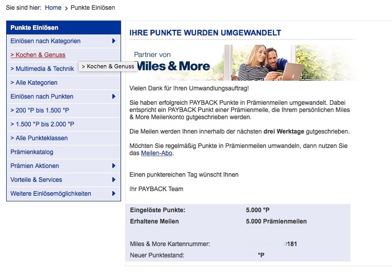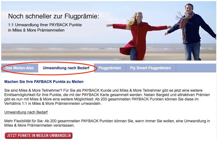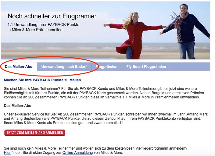 Nun habt Ihr die Wahl, ob Ihr Payback Punkte nach Bedarf in Meilen umwandeln wollt, oder das Meilenabo aktivieren wollt. Beim Meilenabo werden alle 6 Monate Eure gesamten Payback Punkte auf das Miles&More Konto übertragen. Diese Option bietet sich insbesondere für diejenigen an, welche Ihr Paybackkonto nicht managen wollen und regelmäßig überwachen. Da ich die Kontrolle nicht gerne aus der Hand gebe, transferiere ich immer nach Bedarf.