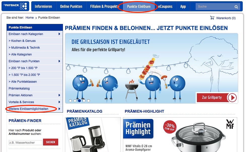 Sobald Ihr Euch in Euer Payback Konto eingeloggt habt, müsst Ihr unter dem Reiter „Punkte Einlösen“, die Option „Weitere Einlösemöglichkeiten“ auswählen. Hier wird Euch das Einlösen von Payback Punkten, gegen Miles&More Prämienmeilen angeboten.