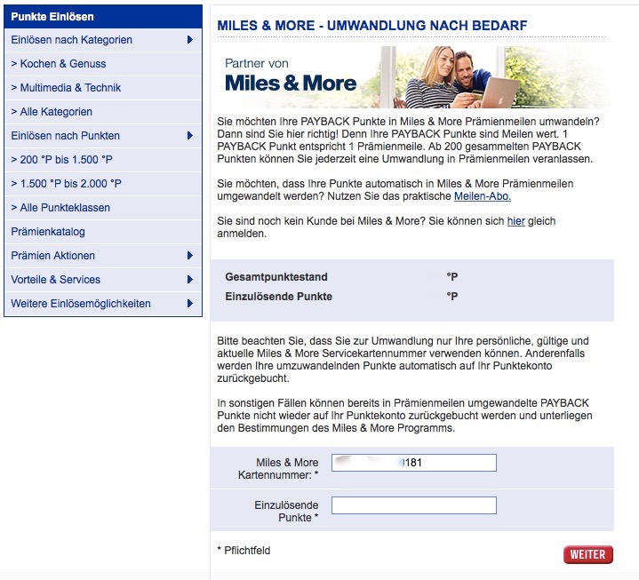 Anschließend müsst Ihr nur noch Eure Miles&More Servicekarten Nummer angeben und die Anzahl von Payback Punkten (min. 200 Punkte) wählen, welche Ihr in Meilen umwandeln wollt. Sobald Ihr auf „weiter“ klickt, werden die Punkte dem Payback Konto abgezogen und können nicht mehr zurück transferiert werden.