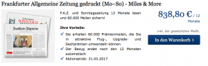 Mit einem Jahresabo der F.A.Z und der Sonntagszeitung erhaltet Ihr ebenfalls auf einen Schlag 60.000 Meilen. Allerdings ist die F.A.Z. mit 838,80 Euro teuer als die WELT und kommt mit einer Ratio von 13,98 Euro je 1.000 Meilen daher.