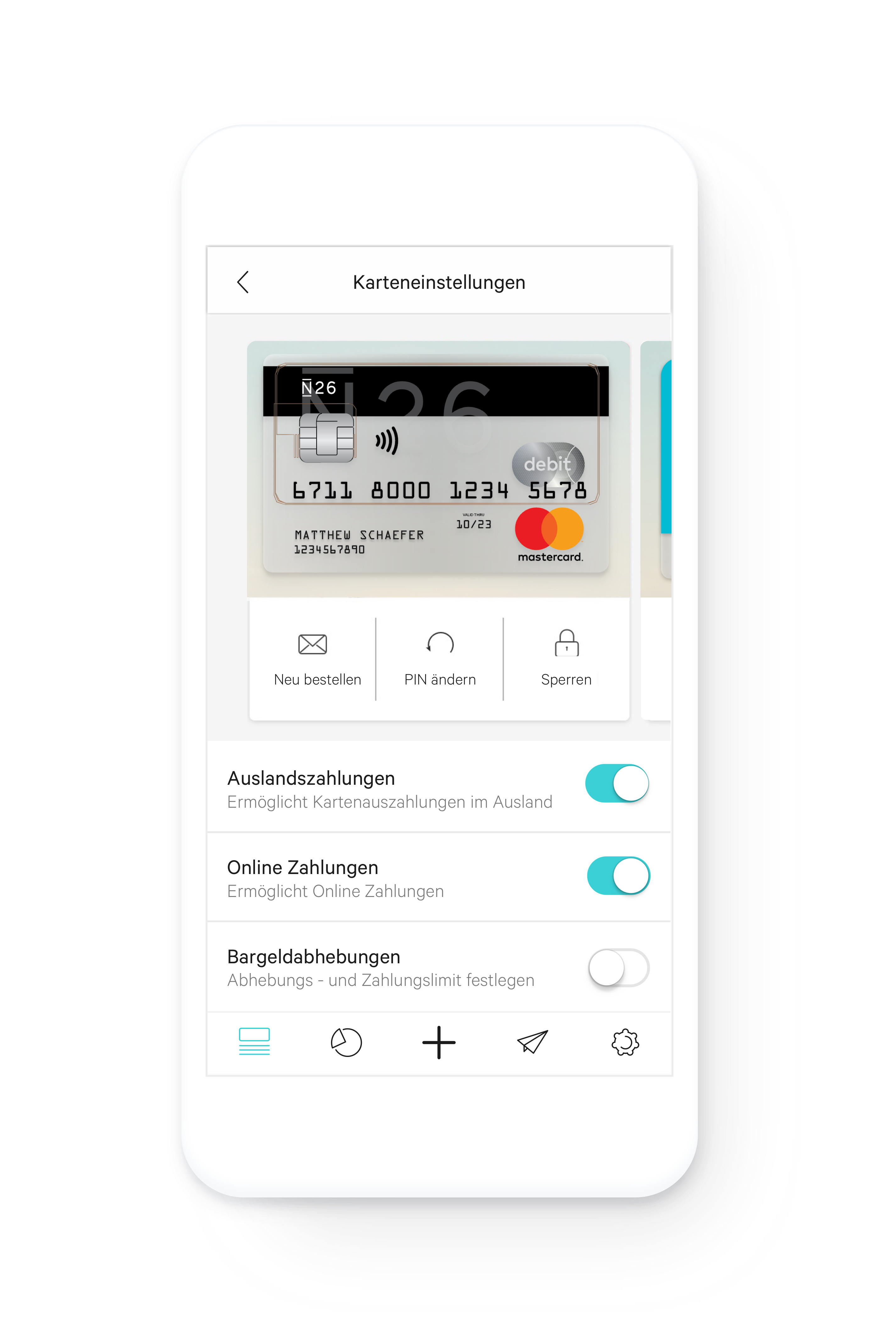 Die N26 Master Card Kreditkarte bekommt Ihr wenige Tage später per Post zugesendet. Bei der N26 Master Card handelt es sich übrigens nicht um eine klassische Kreditkarte mit Verfügungsrahmen und einer monatlichen Abrechnung, sondern um eine Debit Card. Dies bedeutet, dass Ihr immer genau so viel Geld mit der Karte ausgeben könnt, wie auf Eurem N26 Konto gerade ist.