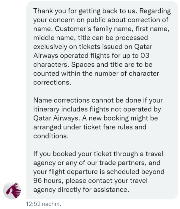 Ich nahm daher noch einmal einen Anlauf und kontaktierte das Qatar Airways Social Media Team über Twitter. Es brauchte gleich zwei Versuche, bis überhaupt eine Antwort kam. Wieder gab es nur ein paar zusammengewürfelte Textbausteine mit einem „nein“.