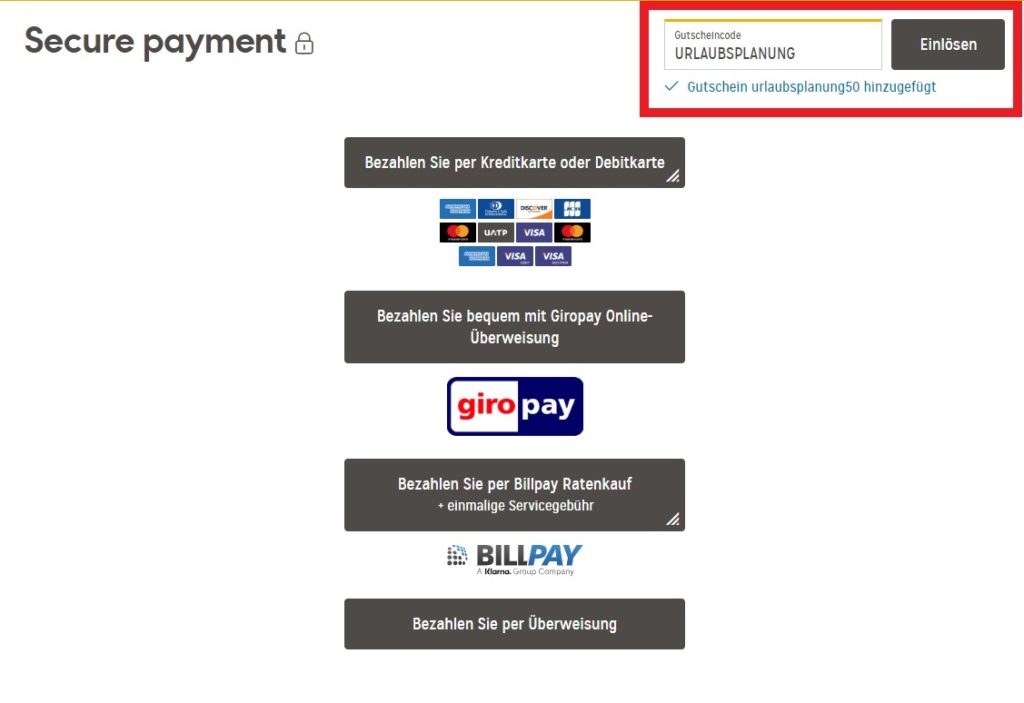 - Im Buchungsschritt „Zahlung“ müsst Ihr dann den betreffenden Gutscheincode oben rechts eingeben.
