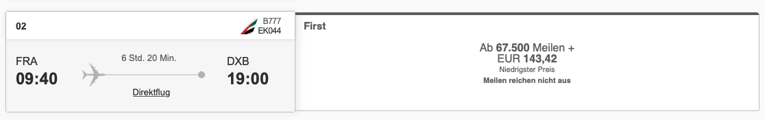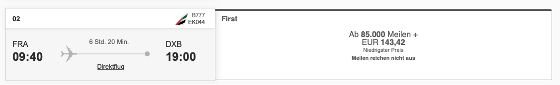 Bei einer Probebuchung im Januar habe ich den ganzen Monat über viele verfügbare Daten auf der Strecke Frankfurt nach Dubai in der Game Changer First Class gefunden. Emirates will für den oneway 85.000 Meilen und überschaubare 143 Euro an Steuern und Gebühren.