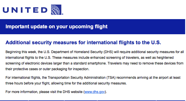 United Airlines hat auf jeden Fall schon vor Abflug auf die neuen Sicherheitsvorkehrungen hingewiesen, ohne ins Detail zu gehen.