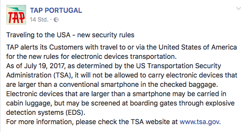 Nachdem es nicht allzu viele Details zu den neuen Sicherheitsvorkehrungen für alle Flüge in die USA gibt und das DHS nicht sehr kommunikativ ist, gab es letzte Nacht bereits einiges an Verwirrung und auch Falschmeldungen. So gab die portugiesische TAP über Facebook bekannt, daxs ab sofort alle elektronischen Geräte die größer als ein Smartphone sind im Aufgabegepäck auf Flügen in die USA verboten sind. Diese Meldung hat sich inzwischen allerdings als falsch herausgestellt, wie das DHS über Twitter verlauten lies.