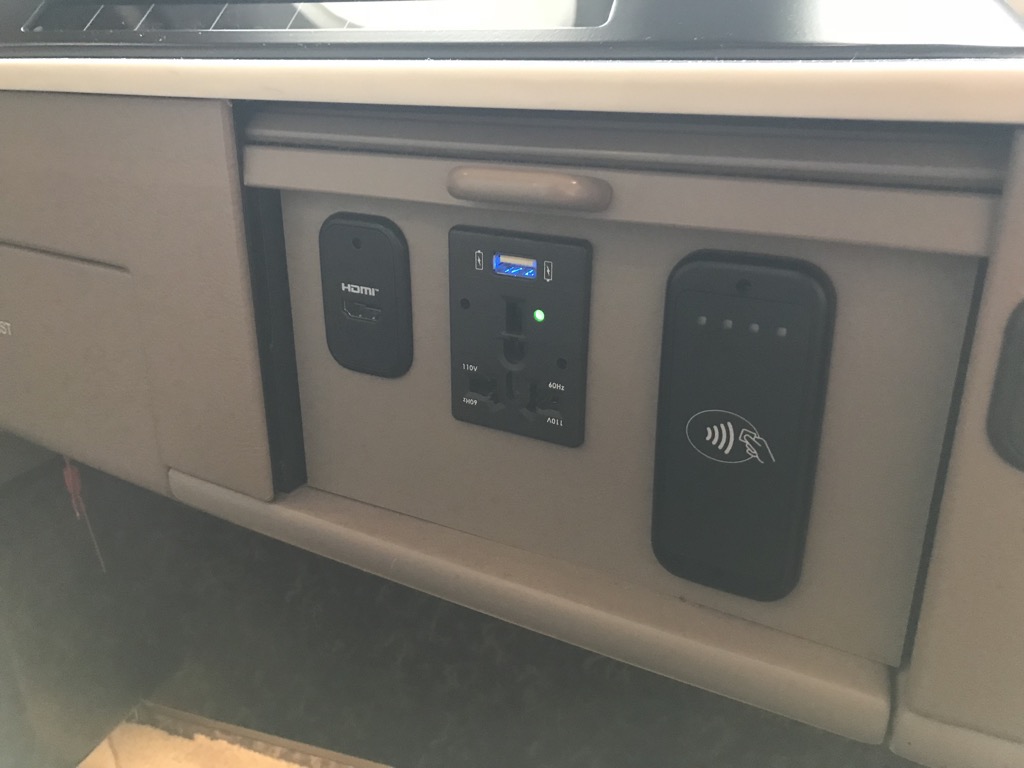 Wirklich erwähnenswert sind die vielen Stromquellen in der neuen Singapore Airlines Suite Class. So verfügt jede Suite über zwei 110 Volt Steckdosen und zwei USB Anschlüsse, sowie einen HDMI Anschluss und einen Kartenleser für Kreditkarten, wofür auch immer dieser gebaucht wird.