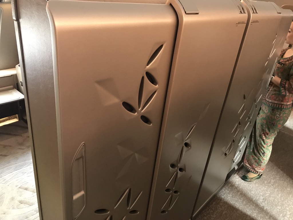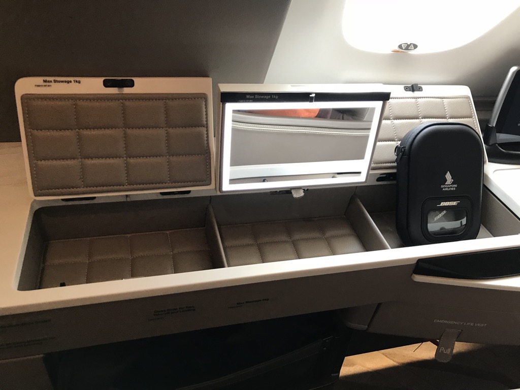 Allerdings gibt es auch noch am Sitzplatz selbst noch jede menge Staufächer für alle Dinge, welche man während des Fluges benötigt unterbringen kann. Auch den Singapore Airlines Schminkspiegel findet man in einem Deckel der Ablagen.