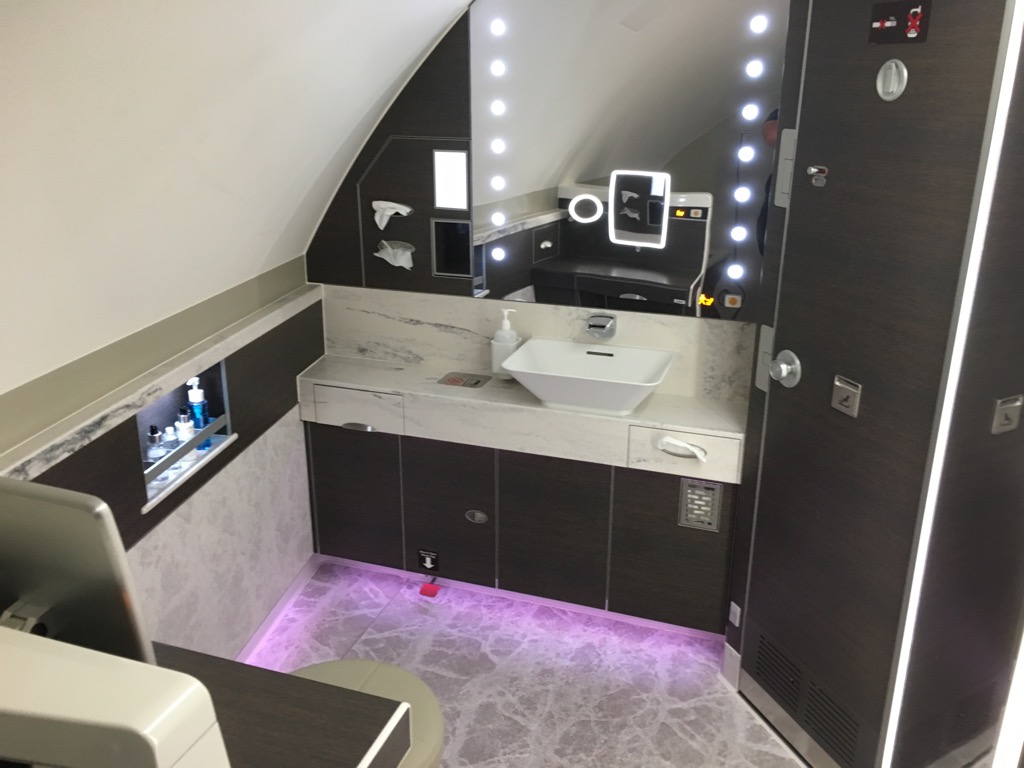 Beim Gespräch mit einem der Flugbegleiter vor dem Start, in welchem ich erwähnte wie toll ich die neue Singapore Airlines Suite Class im Airbus A380 finde, sagte er zu mir, ich solle mir einmal das Bad anschauen, es würde mir gefallen.