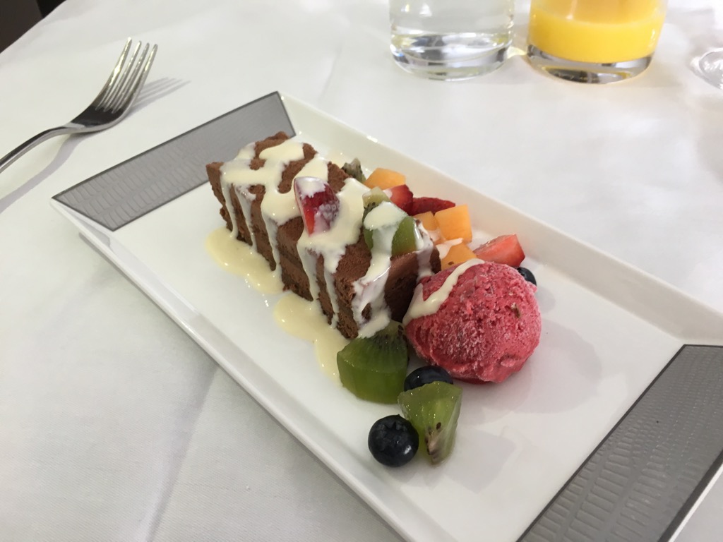 Der Schokoladenkuchen mit dem Eis und den Früchten war lecker und auch schön angerichtet.