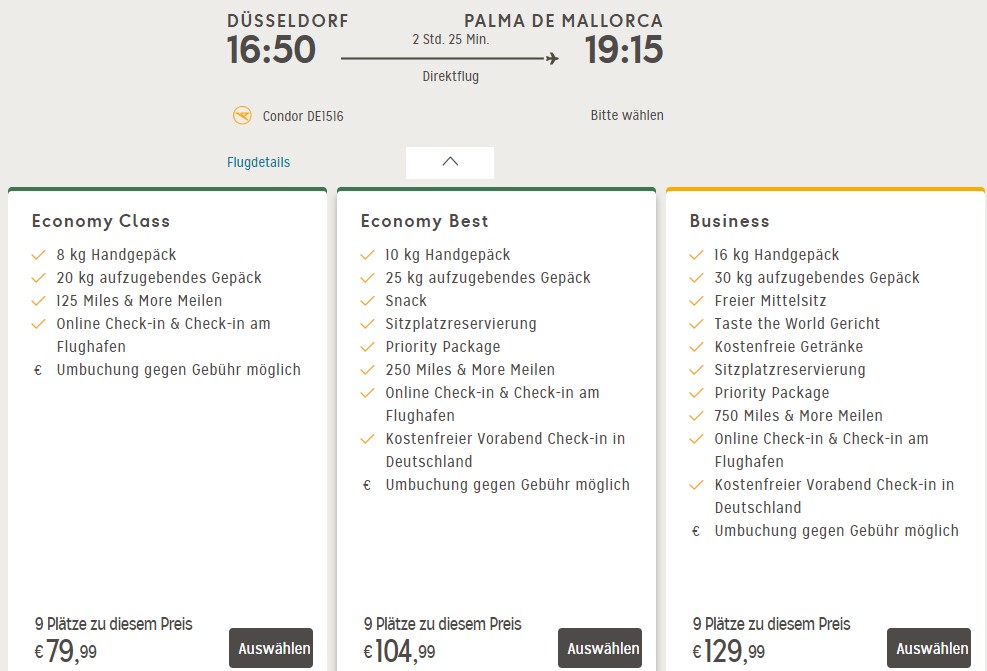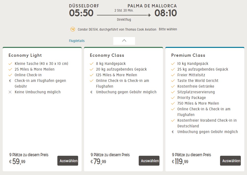 Wir haben den alt vs. neu Preisvergleich gemacht und uns die Auswirkungen auf den Preis an Hand eines Beispiels angeschaut. Für unseren Vergleich haben wir einen Flug von Düsseldorf nach Palma de Mallorca im Februar 2020 und im September 2020 angeschaut. Bei beiden Flügen ist der Economy Classic Tarif zum Preis von 79,99 Euro buchbar gewesen.