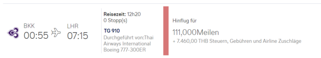 So viele Meilen benötigt Ihr für einen Oneway in der Thai First von Bangkok nach London oder umgekehrt: