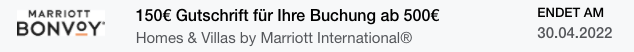 Aktivieren Sie das Angebot für Ihre American Express® Karte erhalten Sie einmalig 150€ Gutschrift für Ihren Kartenumsatz von mindestens 500 Euro bis zum 30.04.2022 in allen teilnehmenden Homes & Villas by Marriott International. Gültig nur bei Zahlungen online.