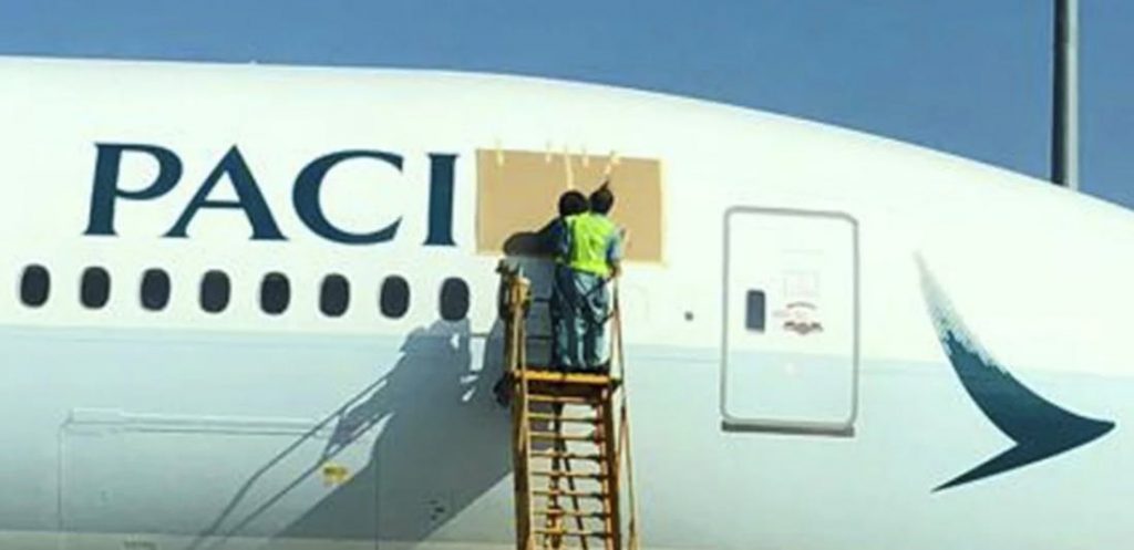 Erst in Hongkong scheint der kapitale Schreibfehler auf dem Cathay Pacific Flugzeug aufgefallen zu sein. Auch wenn man es bei Cathay Pacific’s Twitter Team inzwischen mit einer guten Briese Humor nimmt, war man letzte Nacht in Hongkong von dem Cathay Paciic Schriftzug wohl nicht ganz so begeistert und hat kurzerhand die letzten zwei Buchstaben überklebt um das Gesicht zu wahren.