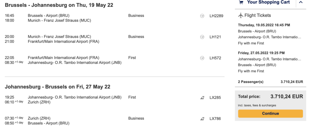 Zusammen mit den Zubringerflügen von Brüssel nach Zürich oder Frankfurt werden Euch nach einem Roundtrip nach Johannesburg insgesamt 35.382 (via Zürich) bzw. 36.406 (via Frankfurt) Statusmeilen gutgeschrieben. Somit würden beide Reisenden als Frequent Traveller rausgehen und künftig auch unabhängig voneinander die Benefits nutzen können.