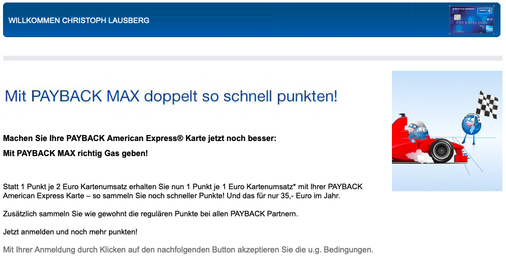 Hhhhmmm. Funktioniert bei mir leider nicht. Wenn ich bestätige, kommt leider eine Fehlermeldung, dass ich es später noch einmal versuchen soll. Ich habe die Amex Payback Karte erst seit ein paar Tagen. Muss man die Karte bereits eine bestimmte Zeit haben, bevor man Payback MAX nutzen kann?