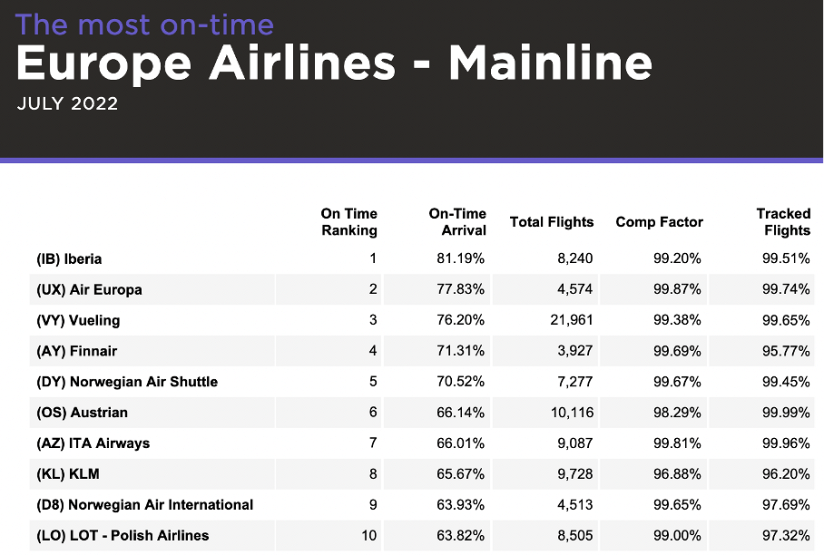 Als pünktlich gilt ein Flug der innerhalb von 15 Minuten nach der planmäßigen Ankunftszeit am Gate eintrifft. Mit einem Wert von knapp 81% aller durchgeführten Flüge schafft es Iberia auf das Siegertreppchen unter den europäischen Gesellschaften. Auch der zweite und dritte Platz geht diesmal nach Spanien, die Positionen von Air Europa und Vueling zeigen, dass diese Airlines in Sachen Pünktlichkeit einiges richtig machen.