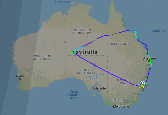 Der jetzige Rundflug führte den Dreamliner von Sydney, welches man direkt nach dem Start in etwa 1.200 Metern Höhe überflogen hat, an die Golfküste, wo man mehrere hundert Kilometer auf knapp 1.000 Metern entlang der wunderschönen Küste flog.