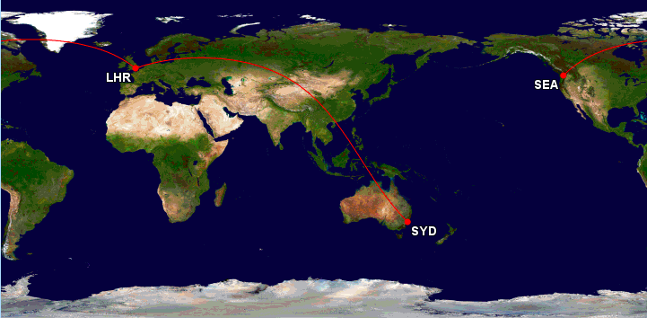 Damit ist die Boeing 747-400 die gleiche Strecke geflogen, wie es die Boeing 787-9 diese Woche machen wird, denn die verwendete  787-9 ist eine Neuauslieferung an Qantas, welche bei der Überführung einen etwas umständlichen Weg über London nach Sydney fliegt.