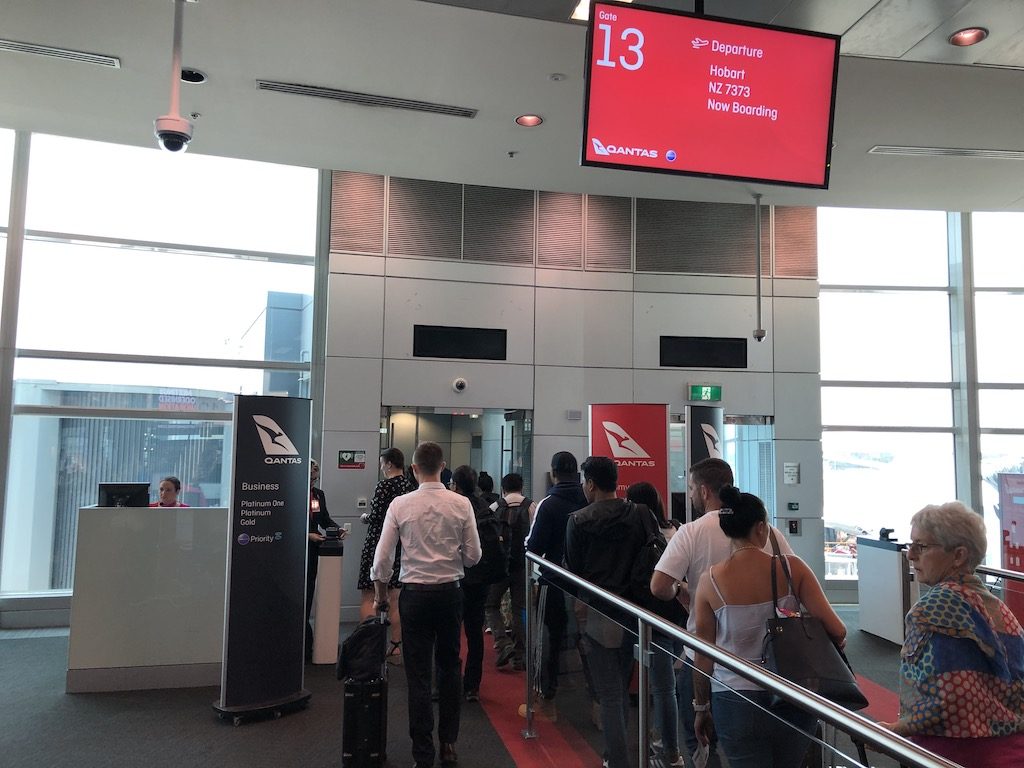 Jedes Gate bietet eine eigene Schlange zum Einsteigen für Business Class Gäste und Statuskunden. Das wird konsequent umgesetzt, was den Andrang selbst bei Flugzeugen mit nur einem Gang etwas entzerrt. Wenn bei Qantas eine Business Class verkauft wird, ist diese auch an Bord. Das trifft auf deren Boeing 717 der Tochter Qantas Link und dem Kurzstrecken-Arbeitspferd, der 737-800 gleichermaßen zu.