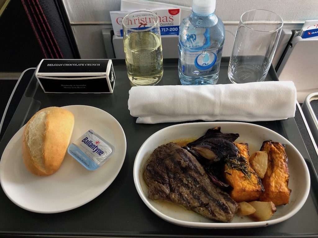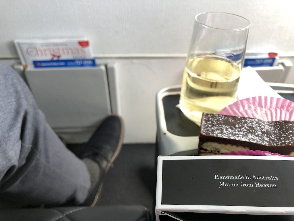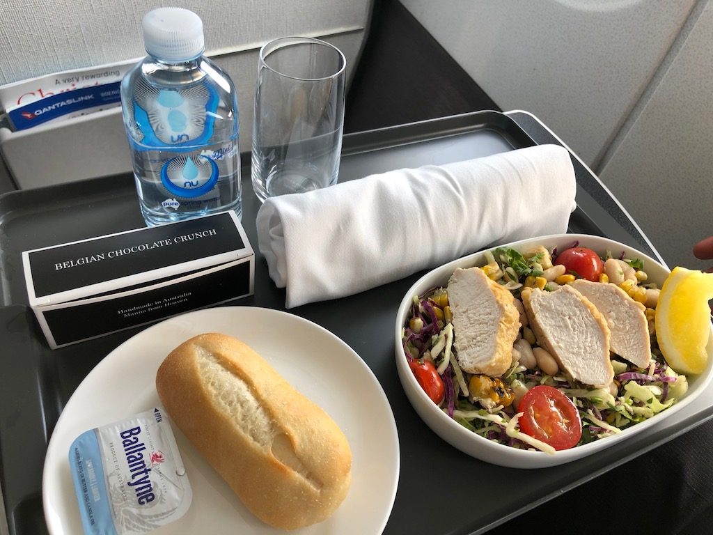 Der Service war sehr aufmerksam, zum Essen standen auf der verhältnismäßig kurzen Strecke ein kalter Salat oder eine warme Mahlzeit zur Auswahl. Verschiedene Weine rundeten das Menu ab, Getränke wurden permanent nachgeschenkt. Die Sitze hatten USB-Anschluß und Steckdosen. Obwohl es keine Internetverbindung gab, wurde das kostenlose Qantas Entertainment per W-LAN für eigene Endgeräte angeboten.
