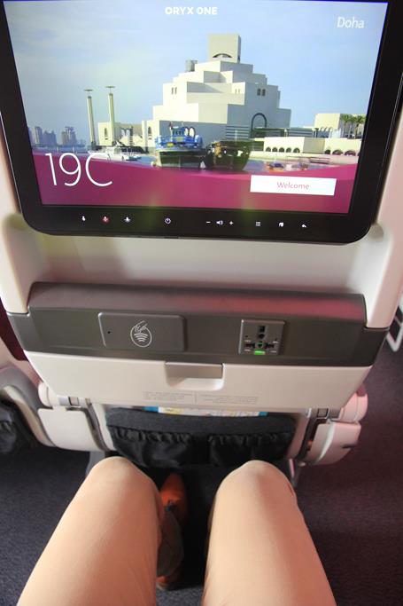 Der Sitzabstand machte beim Probesitzen einen guten Eindruck. Auch auf längeren Flügen sollte man entspannt reisen können. Natürlich gibt es am Notausgang noch Plätze mit mehr Beinfreiheit.