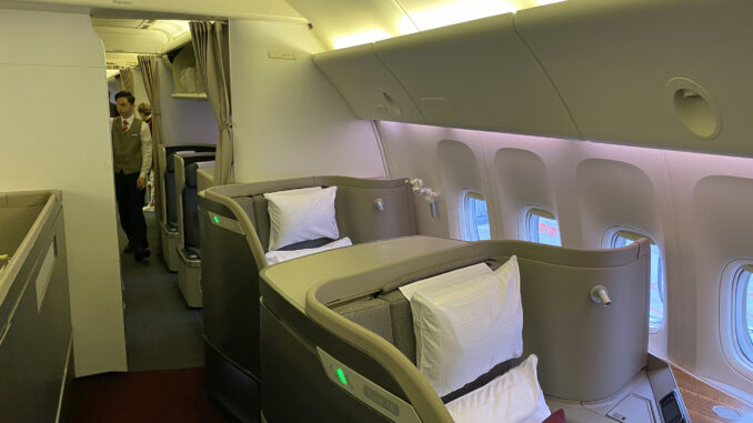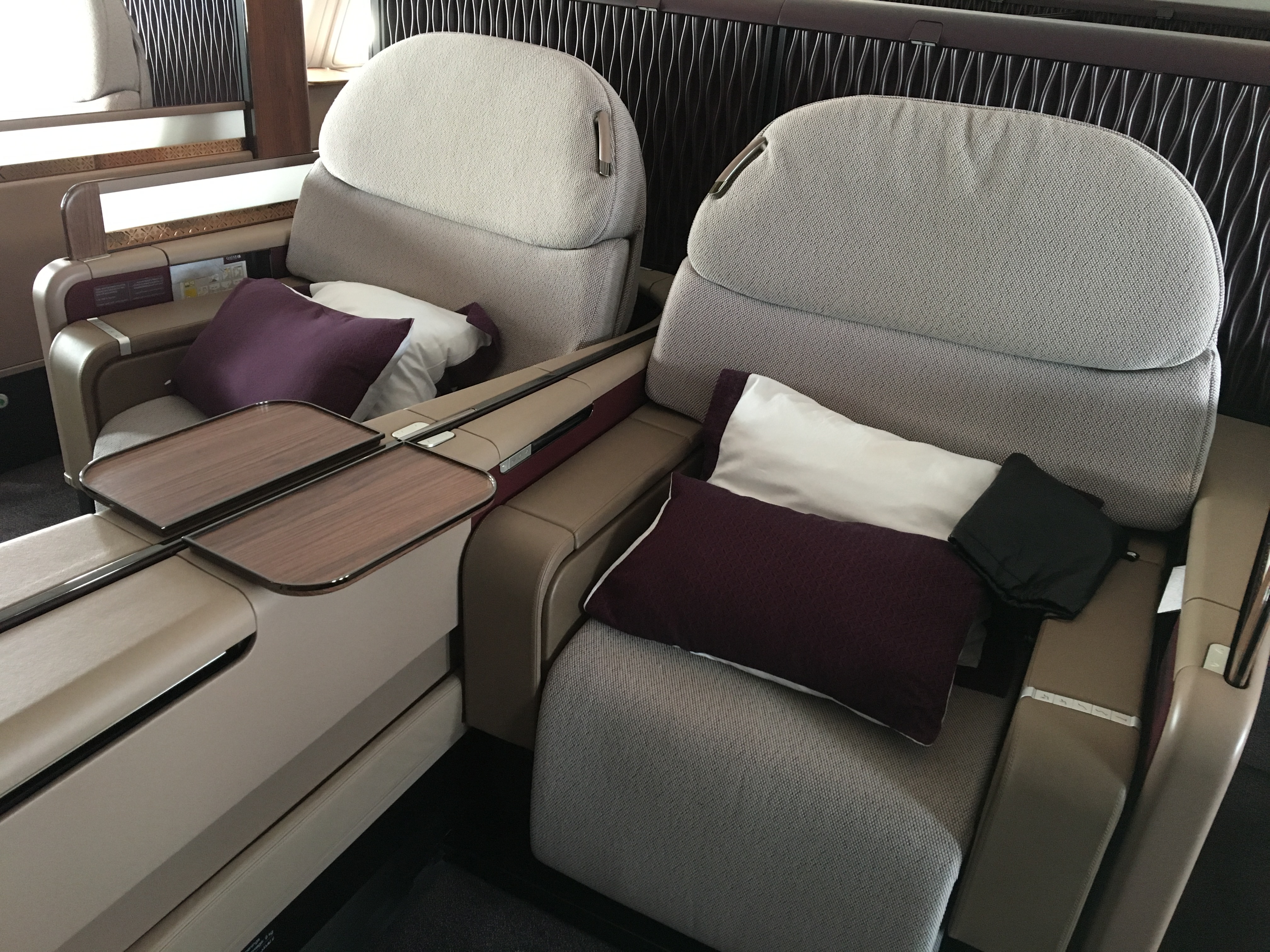 Bei der Buchung wird zwar das Qatar-Produkt angezeigt, dieses ist allerdings nur auf dem Airbus A380 verfügbar. Diese sind 1-2-1 bestuhlt und im Oberdeck des Doppelstöckers installiert. Ihr könnt Euch ein eigenes Bild von dem Kabinenprodukt der Cathay machen, unser Alexander hatte das Vergnügen in de exklusiven First zu reisen und schildert seine Erfahrungen in einer ausführlichen Review.