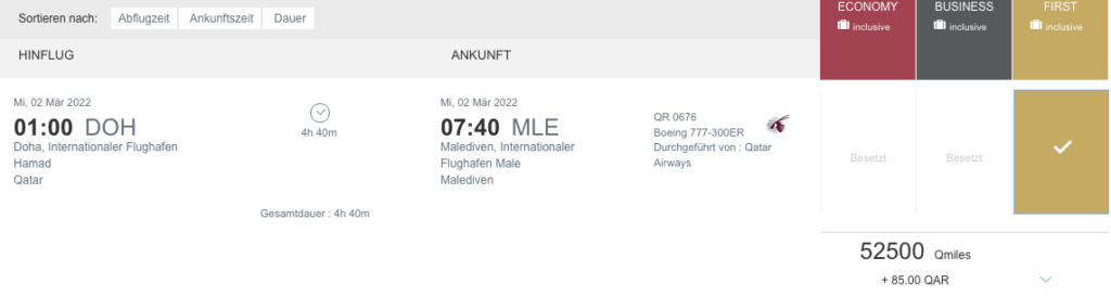 Bei Qatar ist die First buchbar, die Flüge in der Luxusklasse sind auch als Prämie verfügbar. Eine Buchung bei dem eigenen Vielfliegerprogramm kostet bei dem oneway Flug DOH-MLE insgesamt 52.500 Meilen. Besitzer einer American Express Kreditkarte können die Membership Rewards übrigens in einem Verhältnis von 5:4 zum Privilege Club übertragen.