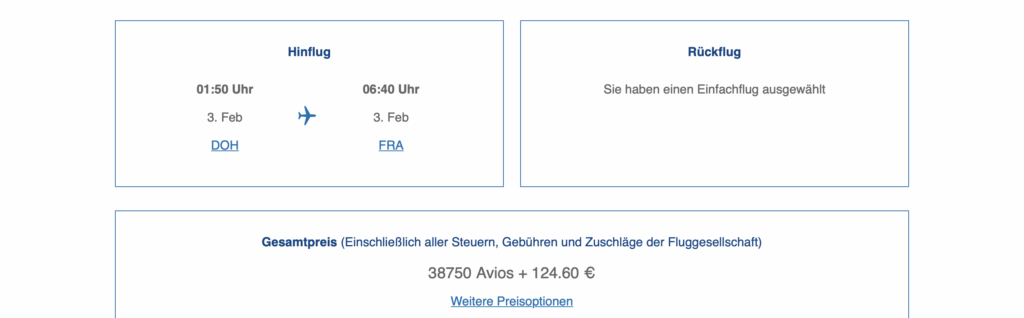 Wer nicht von Berlin, München oder Wien, sondern von Frankfurt oder Zürich starten will, der wird im Asia Miles Programm leider feststellen, dass hier der Flug in der QSuite nach Doha deutlich mehr Meilen verlangt. Dies liegt daran, dass man minimal über den 2.750 Meilen Flugstrecke liegt und entsprechend ein höherer Meilenwert verlangt wird.