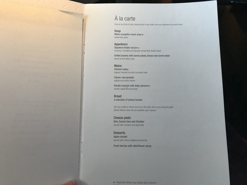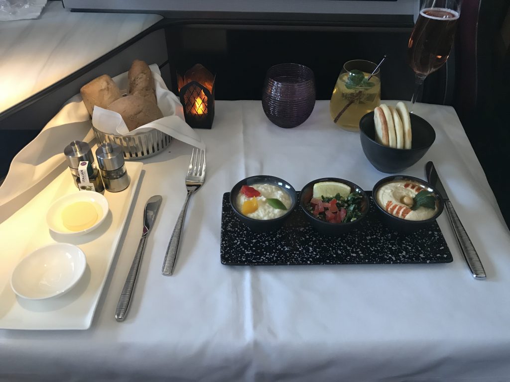 In der QSuite erwartet Euch ein sehr individuelles Servicekonzept. So bietet Qatar ein eine on demand Konzept an, bei dem der Passagier selbst entscheiden kann, wann er essen möchte. Die Crew braucht lediglich 20 Minuten Vorlauf, um alles vorzubereiten. Diesen Service habe ich auch auf diesem Flug genutzt, da ich vor dem Abflug gefrühstückt hatte. Gestartet habe ich mit dem Menü etwa drei Stunden nach Abflug, also ungefähr in der Mitte des Fluges.