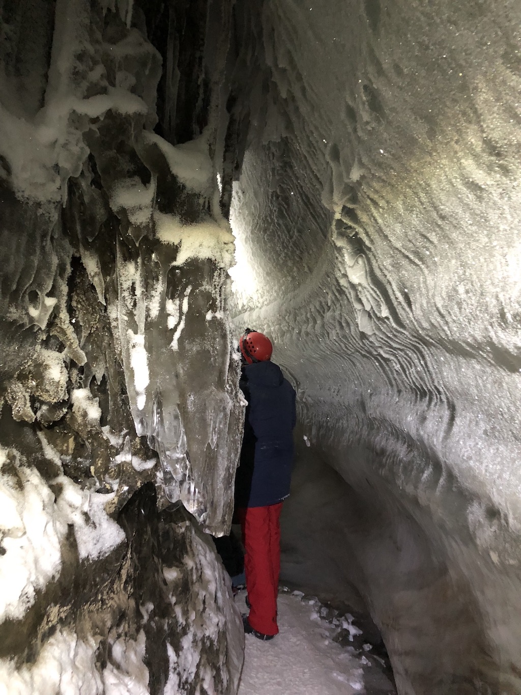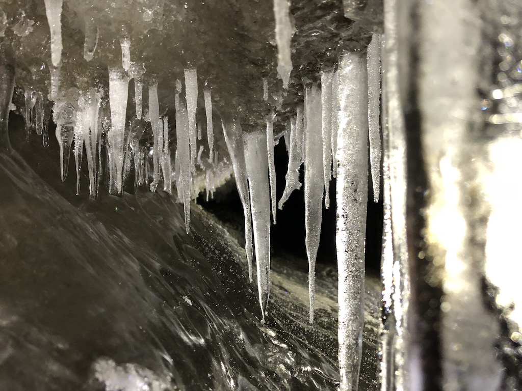 Sicher am Ziel angekommen war bereits der Abstieg in die Eishöhle vorbereitet – ein winziges Loch im Schnee, in welches man rund 3 Meter unter das Eis abstieg – beziehungsweise rutschte. Unten angekommen eröffnete sich eine Welt aus Eis und Stein, welche im Licht unserer Helmlampen glitzert. Die Höhle, welche sich durch Schmelzwasser im Sommer bildet, war extrem lang und verblüffend geräumig und schlängelte sich unter dem Eis, auf welchem wir noch Minuten zur standen entlang.