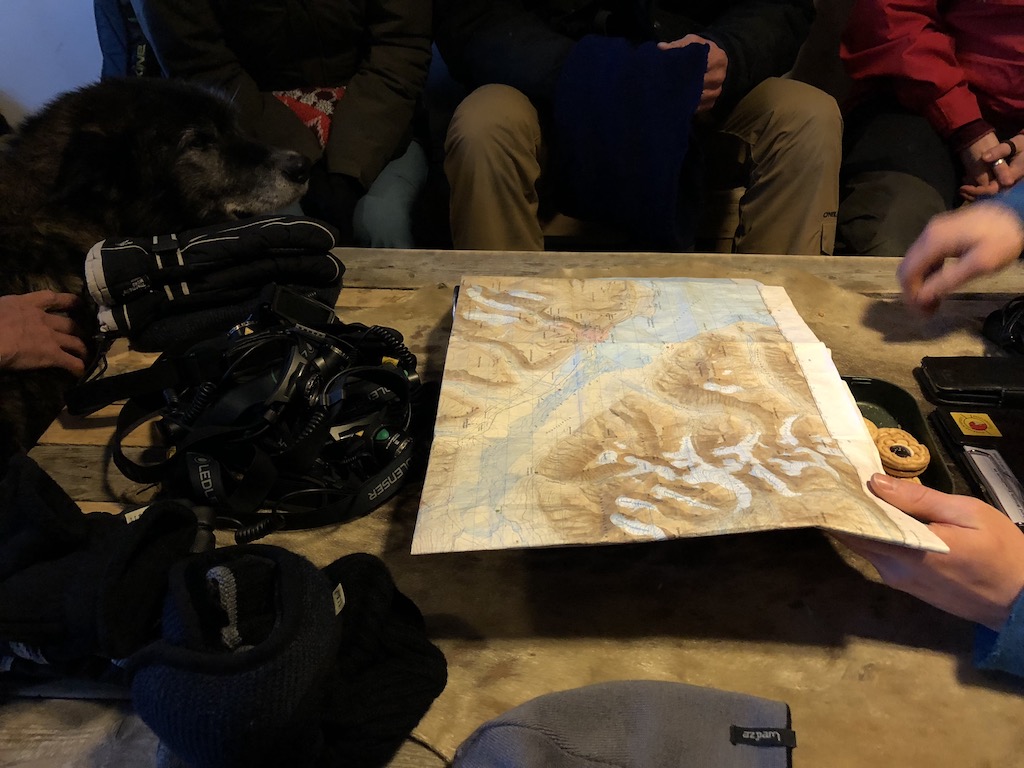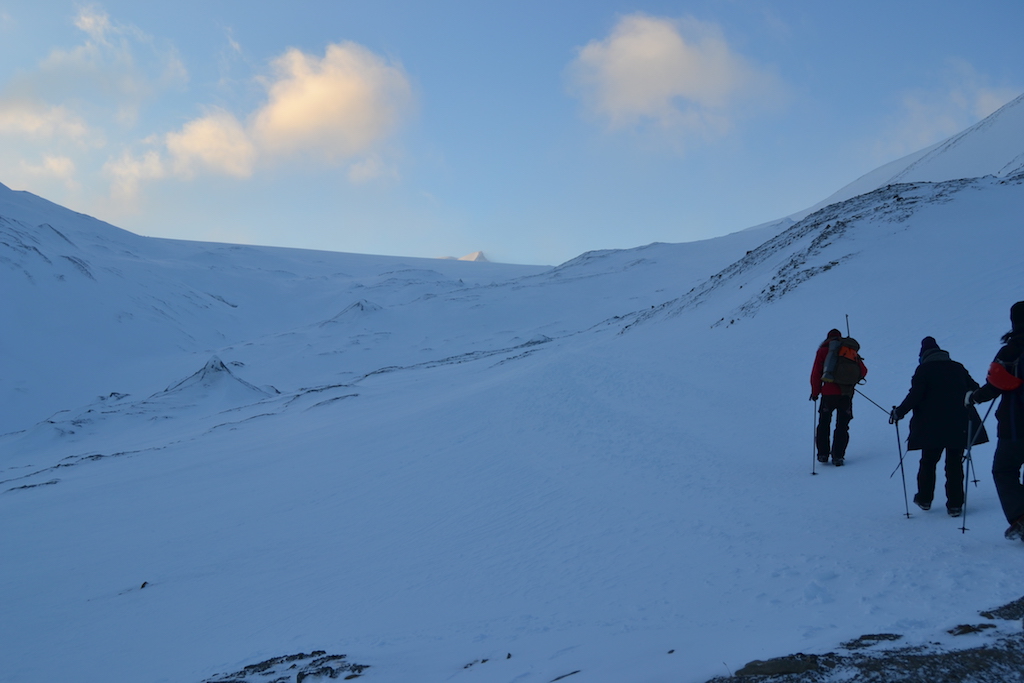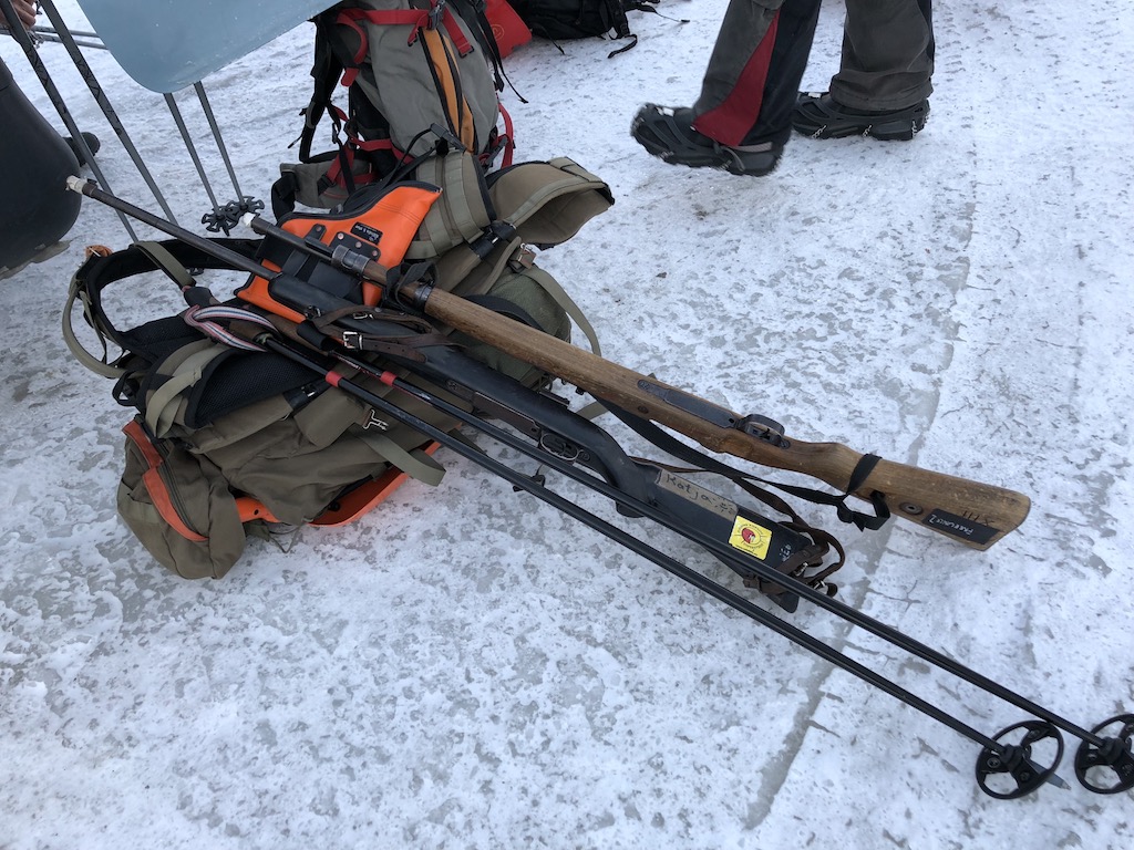 Im „Base Camp“ angekommen wurden wir über das Wetter informiert – es sollte rund – 10 ° Celsius haben, mit Wind teilweise bis zu – 25 ° C gefühlte Temperatur. Aufgrund des festen Schnees verzichteten wir auf Schneeschuhe und wurden mit Eisstöcken und Schuhspikes ausgestattet. Auf einer Karte wurde uns die heutige Route vorgestellt und schon ging es mit dem Van ans nördliche, höchste Ende der Stadt – ab hier trugen unsere Guides immer Schusswaffen griffbereit, auch wenn die Chance einer Eisbärensichtung extrem gering in Stadtnähe ist, taucht jährlich hier und da doch mal einer auf, welcher mit eins zwei Luftschüssen verschreckt werden kann.
