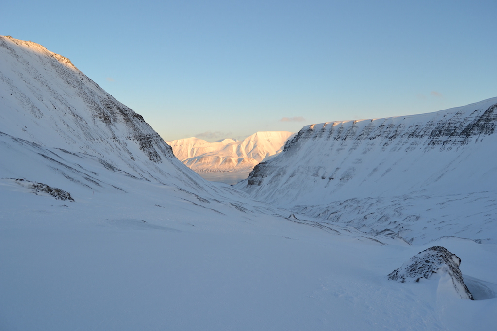 Sobald wir die Huskys an den Schlitten hatten ging es schon los. Jeder Schlitten war mit vier Hunden ausgestattet und pro Schlitten waren zwei Personen – ein Fahrer und ein Passagier. Insbesondere am Anfang mussten wir die Huskys noch extrem bremsen, doch mit der Zeit fanden sie ein angenehmes Tempo und wir konnten über die ewigen Weiten des Tals schlittern, während die Sonne gegen 13 Uhr bereits wieder anfing langsam unterzugehen und die Berge in ein sanftes Orange tauchte.