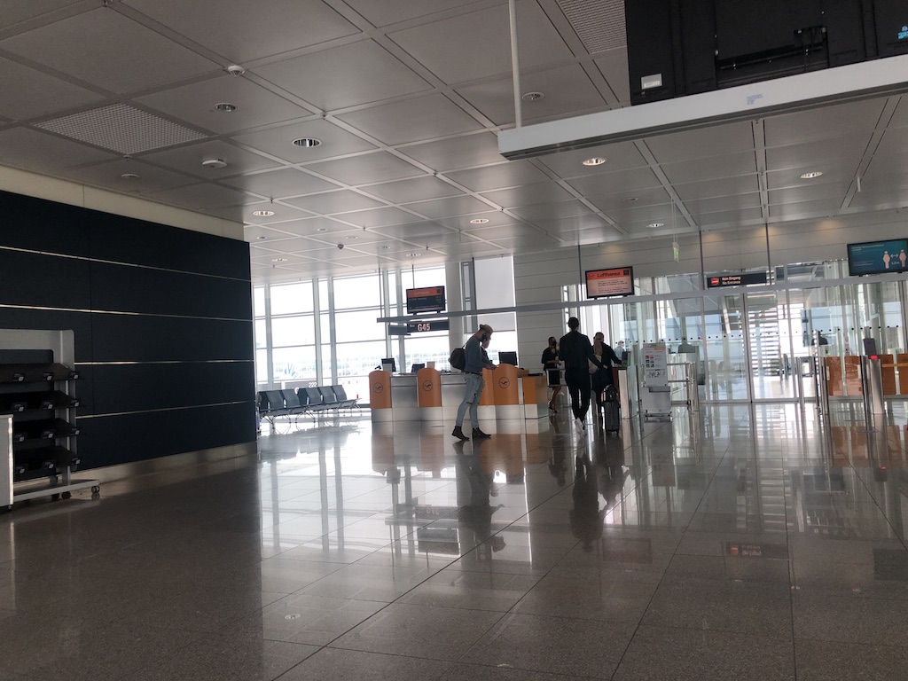 Für Fluggäste und Mitarbeiter gilt im Flughafengebäude München eine Maskenpflicht. Bodenmarkierungen und Durchsagen weisen auf die Abstandsregel hin. Für alle, die nicht online eingecheckt haben oder Gepäck aufgeben möchten, stehen nach wie vor Schalter oder Automaten zur Verfügung. Auf der Abflugtafel war einer von drei Monitoren ausreichend um den Flugplan des verbleibenden Tages anzuzeigen. Normalerweise reichen die Bildschirme nur für einige Stunden aus.