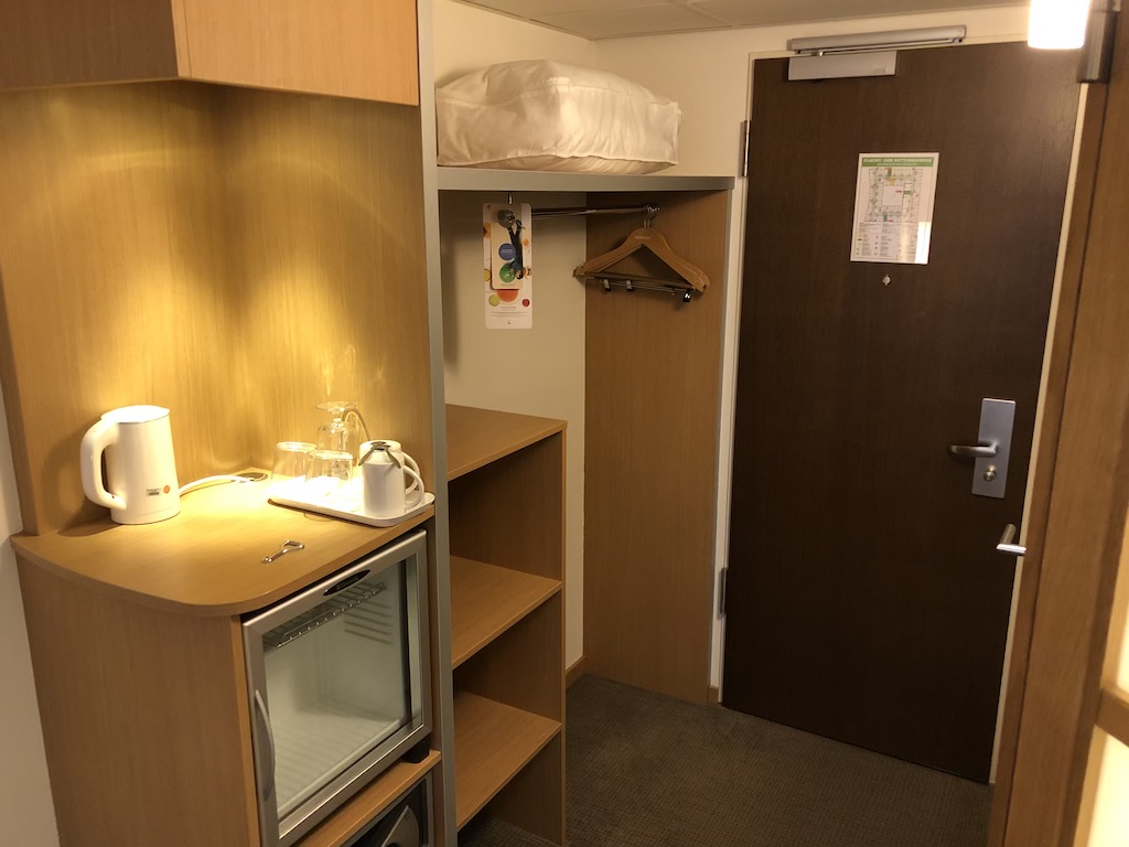 Der Schreibtisch ist beweglich und man muss nicht zwangsläufig mit Blickrichtung auf eine Wand arbeiten. Es gibt Ablagen für Koffer und einen offenen Kleiderschrank. Der Wasserkocher steht zwar samt Geschirr bereit, auf die Zutaten wie Kaffee, Tee, Milch und Zucker wird zur Zeit aber verzichtet.