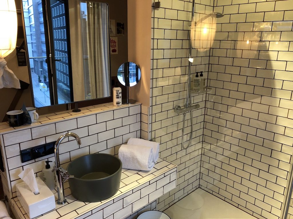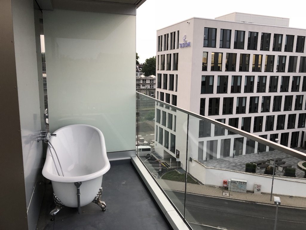 Zunächst erhielt ich ein „Medium“-Zimmer, auf Nachfrage konnte ich jedoch in eins der Zimmer (bei mir im vierten Stockwerk) wechseln, mit denen das Hotel mediale Aufmerksamkeit erlangen konnte: durch die Badewanne auf dem Balkon!