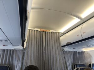 Der Vorhang zur Economy Class wurde geschlossen, eine Flugbegleiterin versorgte die Passagiere mit Getränken.