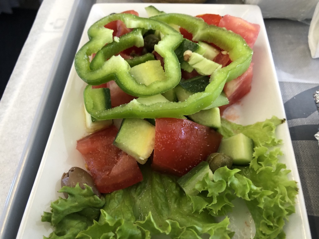 Ich hatte ein veganes Sonderessen vorbestellt und entsprechend eine eigene Vor- und Nachspeise. Mein Begleiter hatte sich für das reguläre Gericht entschieden und den Lachs als Vorspeise bekommen.