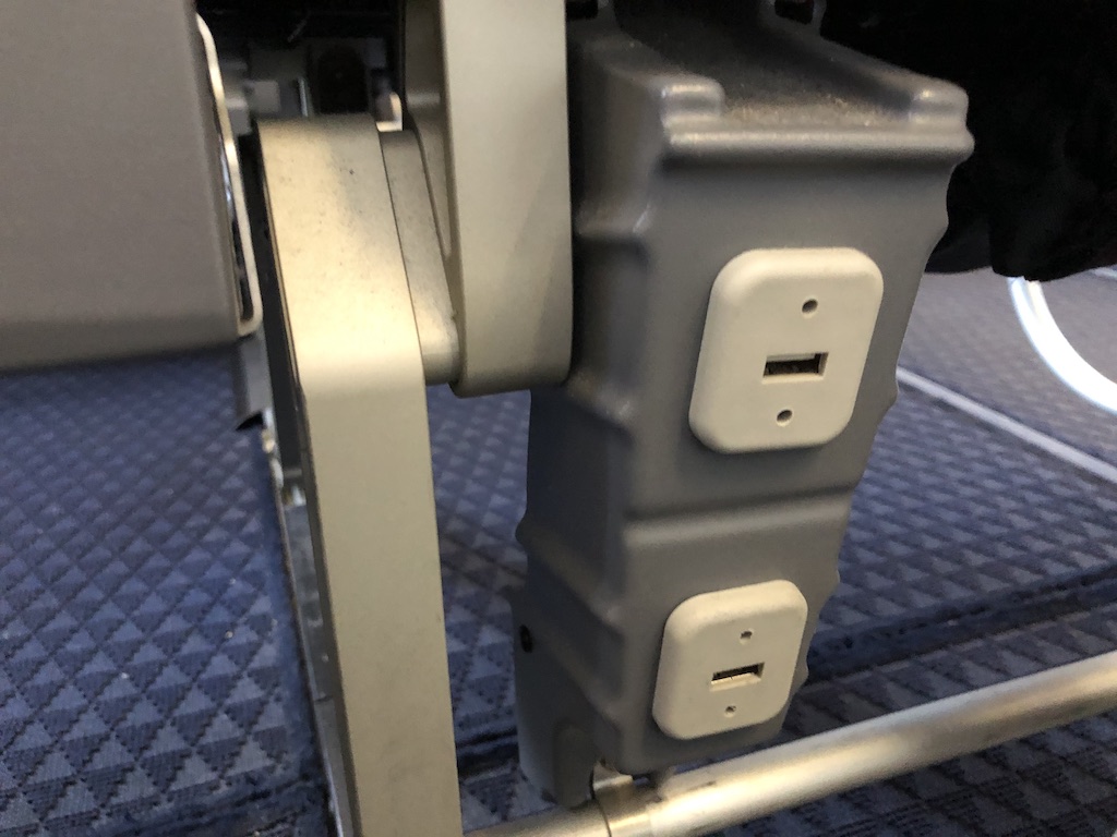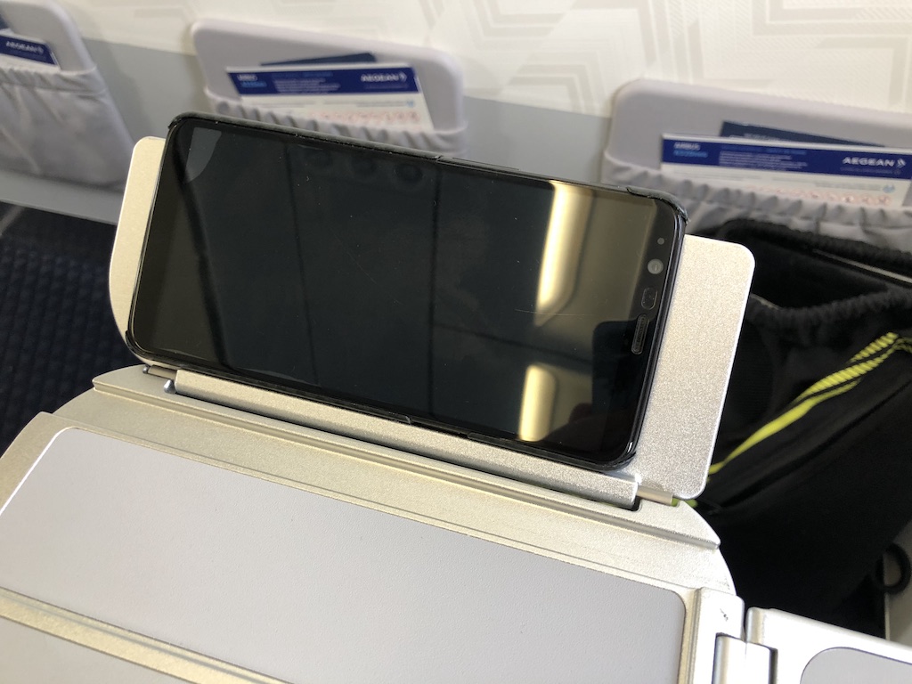 An den Sitzen gibt es nun USB-Anschlüsse, die im Flug aktiviert werden. Ich war zwar mit einer Powerbank auf den Flug vorbereitet, habe diese aber nicht benötigt. Ein zusätzliches Feature wurde in die Tische installiert, dort findet man nun eine Halterung für Smartphones und Tablet-Computer.